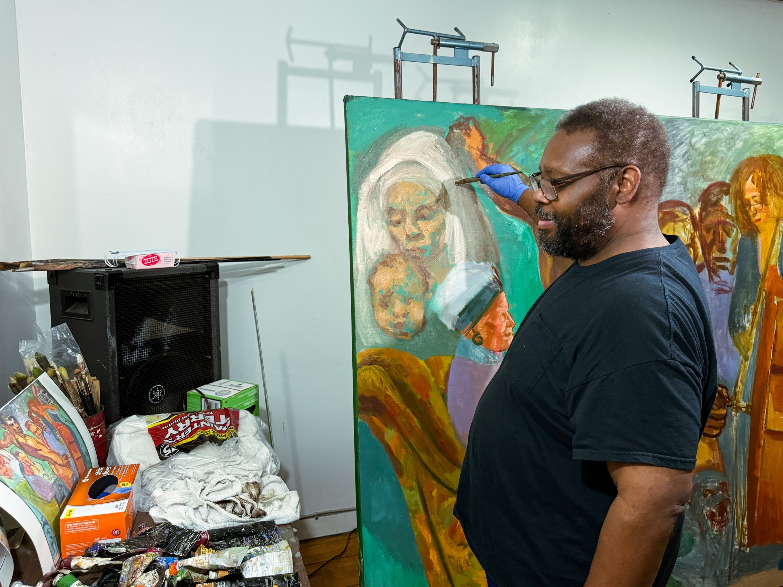 August 2024: Richard Lewis (2011 Kresge Artist Fellow) working on a large painting--a tribute to the late LeRoy Foster--on heavy canvas