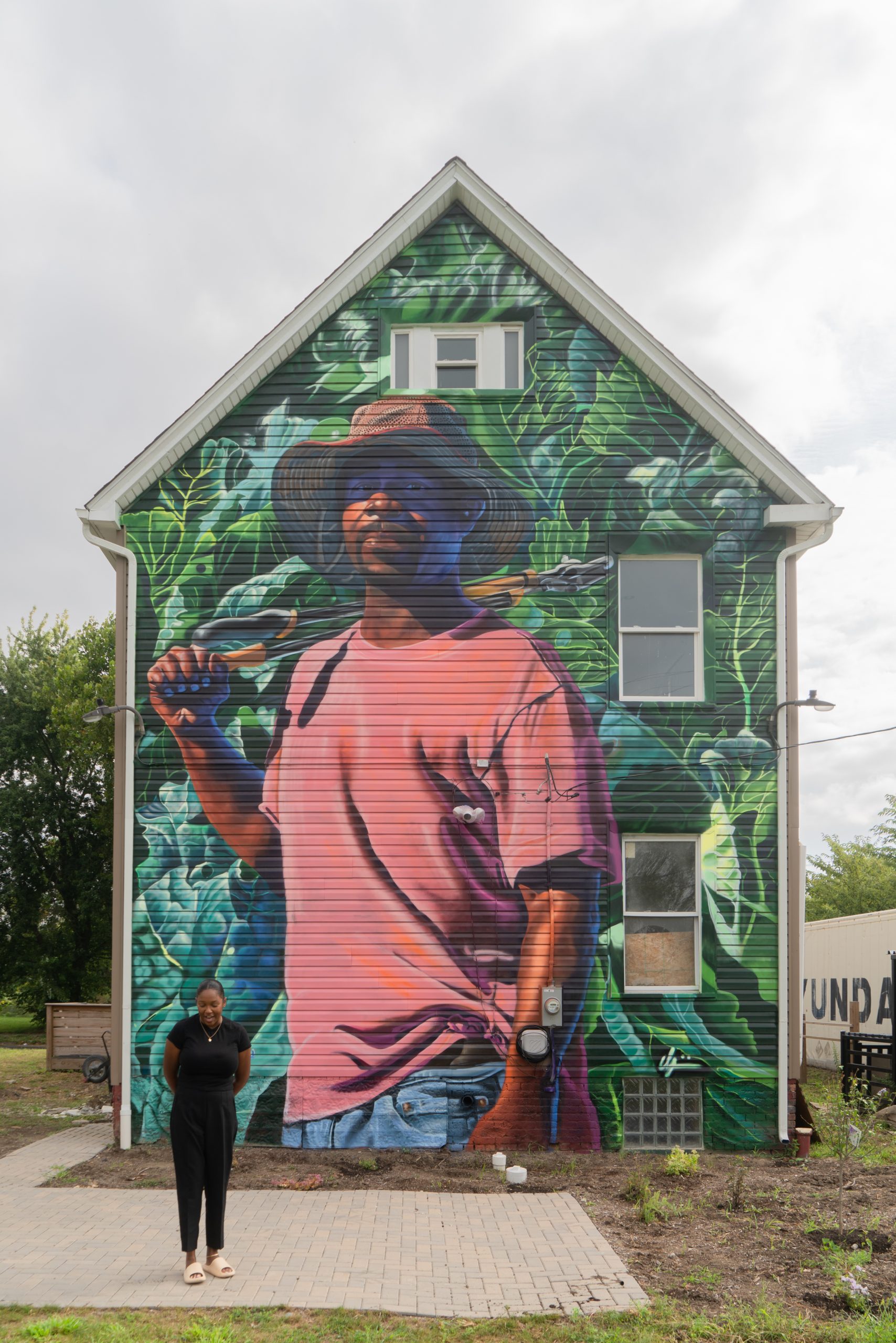 September 2024: Ijania Cortez (2021 Gilda Award recipient) in front of her mural "Carlos" at Oakland Avenue Farms