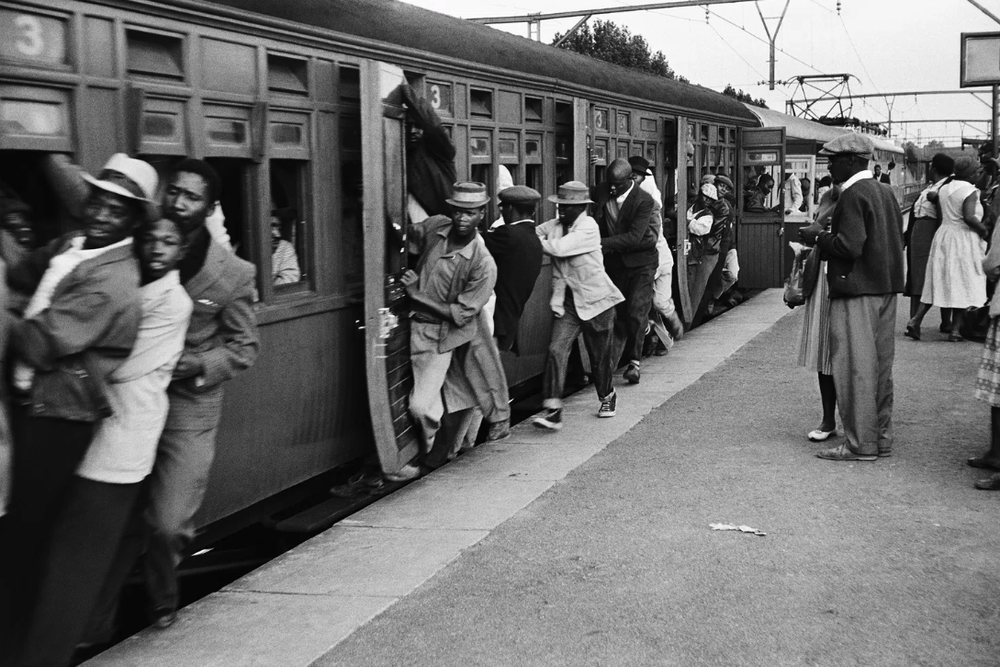 Left”: Woodward, 2018. Right: Ernest Cole’s House of Bondage, Aperture. Whistle has sounded, train is moving, but people are still trying to get on, South Africa, ca. 1960s, copyright © Ernest Cole Family Trust.