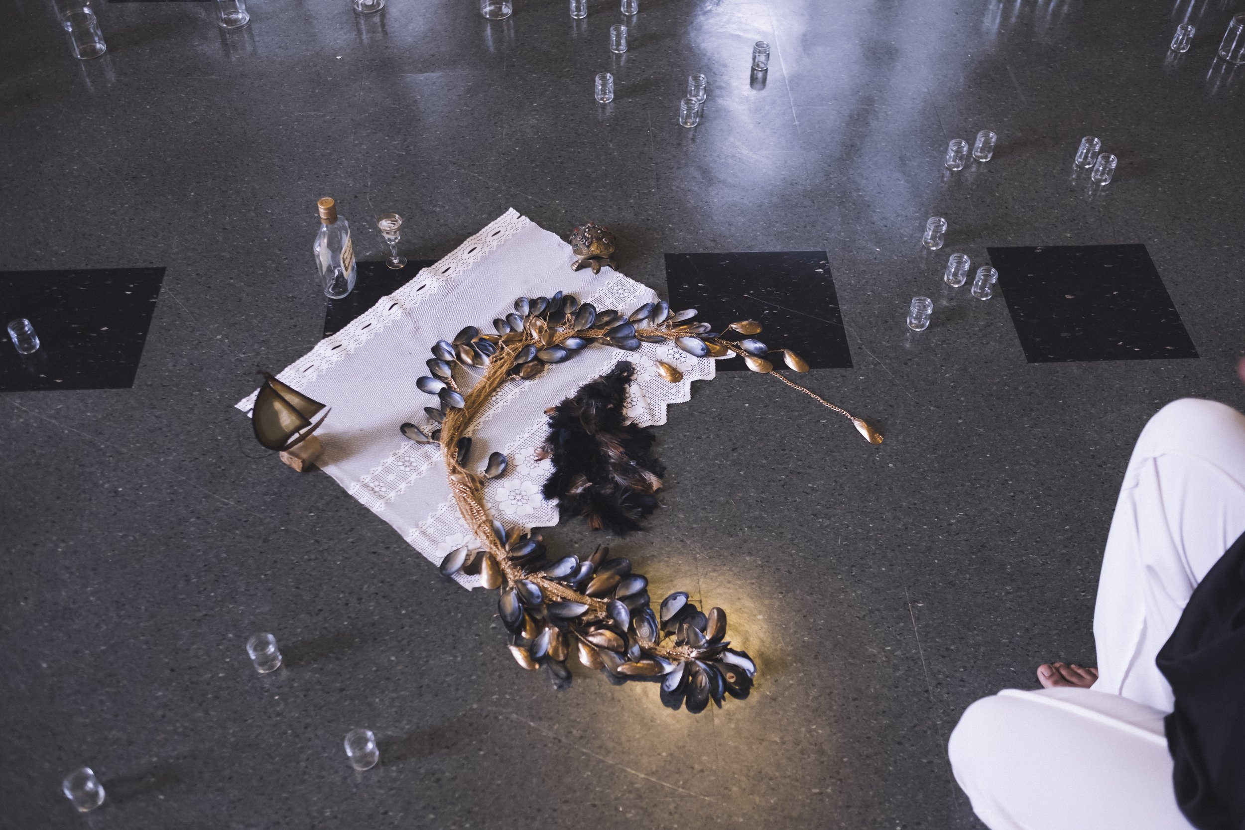 Otherlogue, 2019, interactive performance installation with mason jars, family artifacts, and sound sculpture of chains and mussel shells. Commissioned by Contemporary& and the Goethe Institut for Show Me Your Shelves. Photo documentation by Kashira Dowridge. Video documentation by Desmond Love.